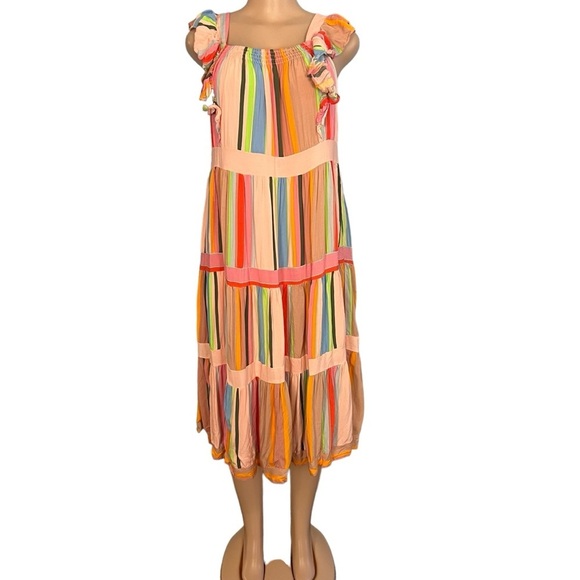 Entro Colorful Rainbow Striped Tiered Midi Sundress in Size Medium