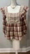 Beautiful Entro “Corrine” boho-style blouse in a soft brown and beige plaid pattern. Features a square neckline with a textured woven front panel decorated with colorful embroidered accents and delicate lace trim. The sleeves are long with a slight puff, and the fit is relaxed and flowy — perfect for a cozy, feminine look.