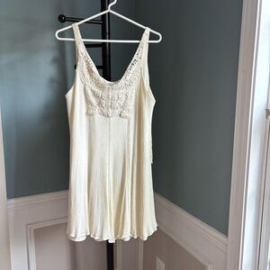 This elegant cream chemise by Entro features intricate lace embroidery detailing on the neck. Crafted from a light and flowy fabric, it offers a comfortable fit with a gentle flare for added movement. Dress is lined.