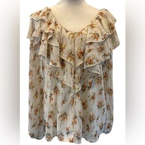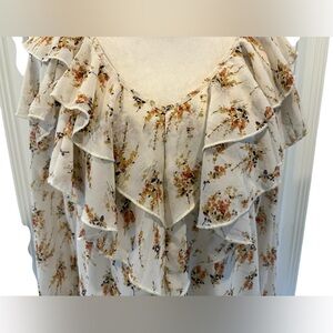 This elegant Entro blouse features a delicate cream base adorned with a subtle floral pattern in earthy tones. The design is complemented by romantic ruffles and a distinctive bib collar, creating a sophisticated and airy look perfect for any occasion.
