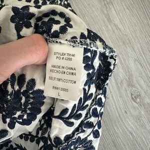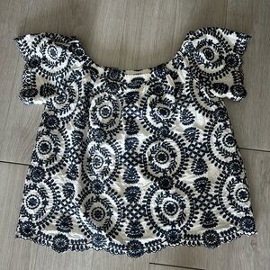 Chic top with navy embroidery on white fabric. Ideal for casual wear.