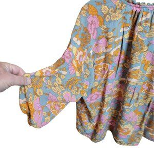 Super cute floral pattern on a light blue background. Ruched sleeves and v-neck front make this loose fitting blouse just the thing your wardrobe needs.