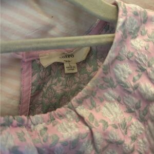 Elegant top with floral pattern. Features soft pink and silver hues. Ideal for casual wear.
