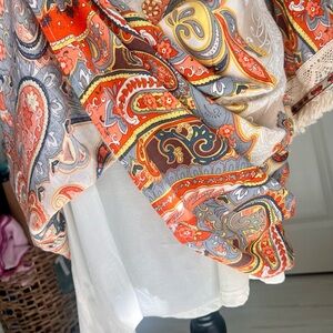 Chic mini dress with paisley print and fringed sleeves. Features cream and orange tones. The dress is lined creating a soft and comfortable fit. Perfect for casual outings.