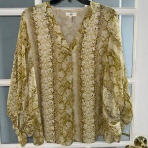 Elegant blouse with gold and cream design. Features V-neck and long sleeves. Ideal for any occasion.