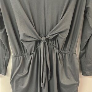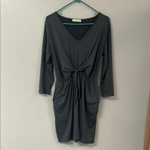 This elegant gray sheath dress by Entro is perfect for a cocktail event or a night out. It features a flattering ruched design with a tie front detail, complemented by a V-neckline and 3/4 sleeves. The soft, stretchy fabric ensures a comfortable and form-fitting silhouette.