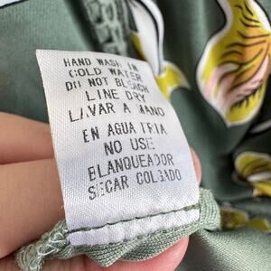 Excellent preowned condition. Green floral print sleeveless lightweight lined split neck pullover mini dress. Has crochet detail down front. Hangs slightly longer in back. Polyester material. Approx. measurements: Shoulder to hem 34-36", pit to pit 19". Size S.