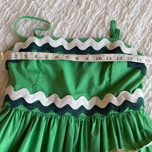 Beautiful boutique-style midi dress featuring adjustable spaghetti straps and a flattering fitted bodice with flowy skirt. Gorgeous green color with white and dark green ric rac trim detailing at the bust and hem for a fun retro-inspired look.