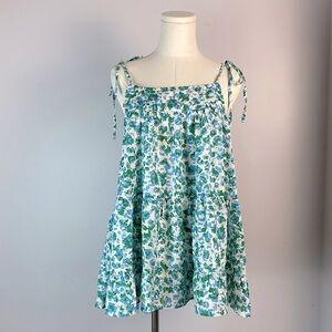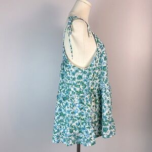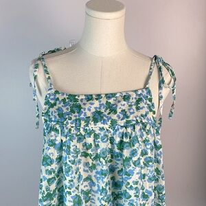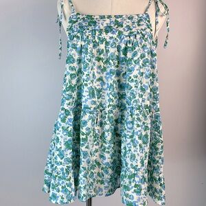 This tank features a spotted leopard print, round neckline, adjustable tied straps, fully lined, and a tiered babydoll fit.