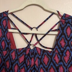Pre owned excellent condition no holes stains or rips snake print square neckline with crisscross and keyhole detail flowy and comfortable. The back is slightly exposed