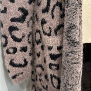 Chic leopard patterned cardigan. Soft and stylish. Ideal for layering. Complete with side pockets and eyelash style fabric
