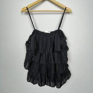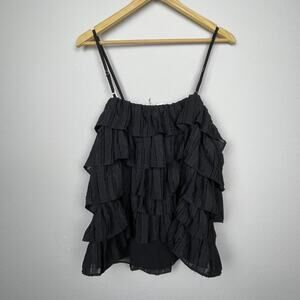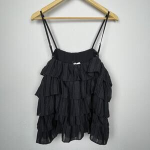 Entro black tiered ruffle top in size Medium. Features soft velvet textured stripes, a tiered silhouette, and a vampy, whimsigoth aesthetic—perfect for gothic, festival, or dark romantic styles. Lightweight and flowy with subtle shine. 100% Polyester.