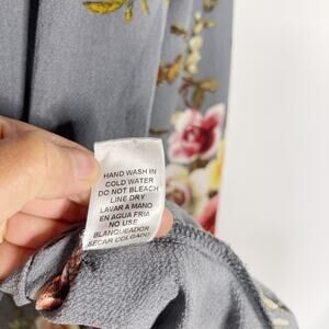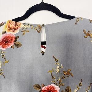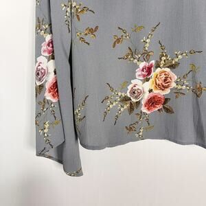 Entro Medium M Gray Floral Bell Sleeve Crossfront Blouse Top Keyhole Back Flower