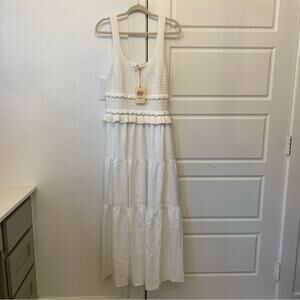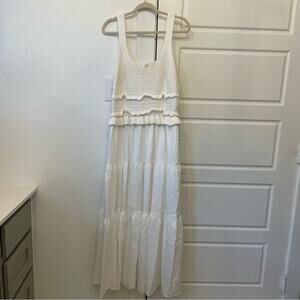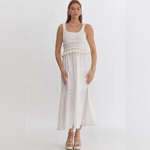 Stylish cream maxi dress with a textured top and flowing skirt. Perfect for any occasion.