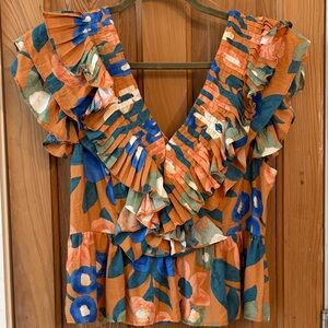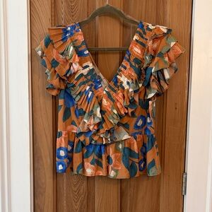 Vibrant floral blouse with ruffle details. Features a mix of orange, blue, and green. Perfect for adding flair to your outfit.