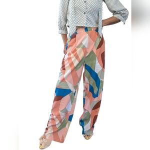 keywords: boho, abstract, geometric, multicolor, Spring, Summer, satin, silky, casual, high waisted, trouser, business casual, versatile, day time, going out, workwear, office, cute, neutral, whimsical, whimsygoth, maximalist, wide leg abstract pants, Summer casual pants, women's abstract print pants, Avant Garde, lightweight pants, casual printed pants by Entro, Bohemian print pants, boho chic pants, festival pants