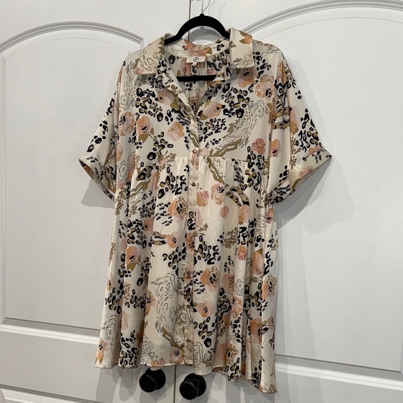 Stylish button-up dress with a vibrant pattern. Features short sleeves and a comfortable fit.
