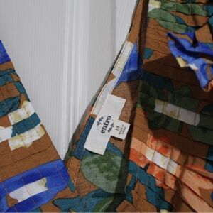Vibrant ruffle blouse with floral design. Features blue, green, and orange tones. Perfect for casual outings.