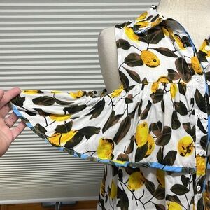 Entro NWT Off White Lemon Print Button Down Open Shoulder Ruffle Top