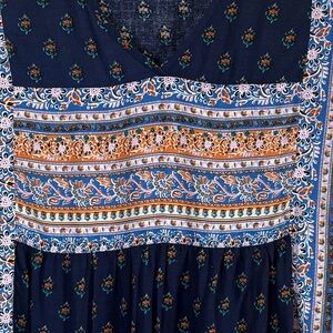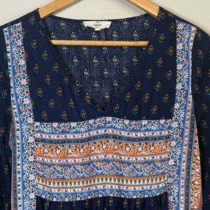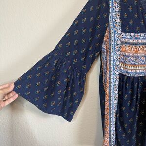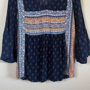 Entro Navy Blue Boho Split Neck Flare Sleeve Floral Pattern Lightweight Shirt LG