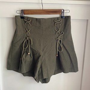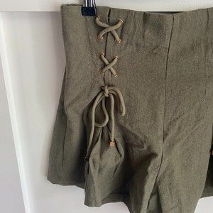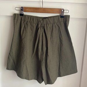 Entro olive green, high waisted, linen dress shorts in size medium. Ties in front can be adjusted. Zipper and clasp in the back. High waisted. Stretchy band in the back only. Never worn, tried on only.
