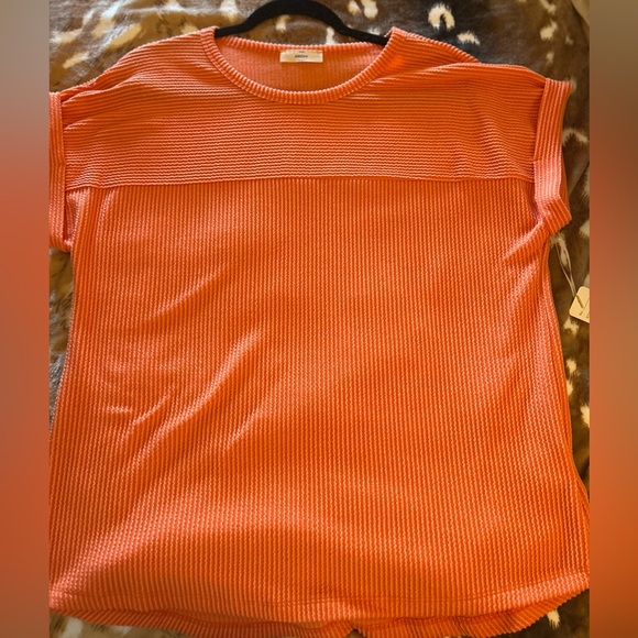 Vibrant orange ribbed top. Short sleeves. Casual and stylish.