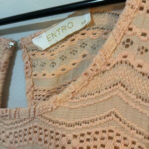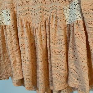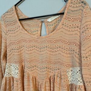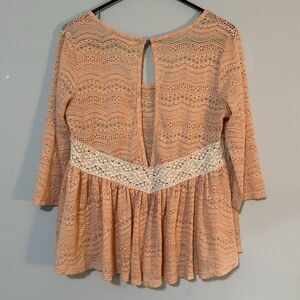 100% cotton white & peach lace three-quarter sleeve peplum blouse with a keyhole opening clasp in back and crochet detailing at the waist.