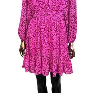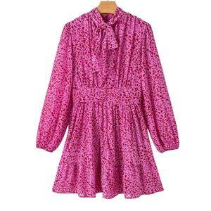 Entro pink dress, leopard print mini dress, bow neck dress, high neck ruffle dress, long sleeve party dress, feminine tiered mini dress, pink fall dress, holiday dress, date night dress, boutique style, new without tags