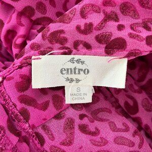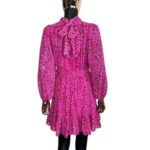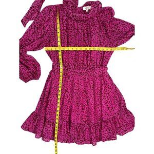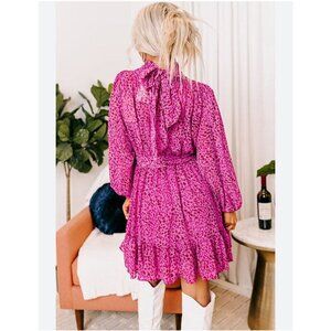 Gorgeous Entro pink leopard print high-neck mini dress, size Small — new without tags and never worn! Features a tie-neck detail that can be styled two ways (front or back), giving you two looks in one. The design includes a back zipper and button closure, long sleeves with elastic cuffs, a tiered ruffle hem, and a flattering elastic waistband. Comes with a matching spaghetti-strap slip liner for perfect coverage. Includes an extra button.
