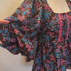 Stylish blouse with square neckline. Features pink and blue floral design on a dark base. Ideal for a vibrant look.