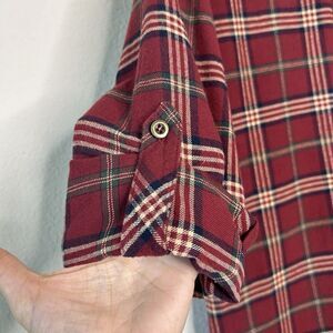 Add a touch of class to your wardrobe with this Entro Plaid Red Flannel Tunic. The tunic features a crew neck when buttoned or leave unbuttoned for a v-neck. It comes in a size L and is made of soft and comfortable cotton flannel material. The tunic is perfect for traveling, casual outings, or business meetings. The tunic has a classic plaid pattern in red and features silver sequins on chest pocket and back yoke. Two hip pockets and optional roll tab sleeve for practicality! Perfect for the fall, winter, and spring seasons. Make a statement with this Entro Plaid Red Flannel Tunic and add it to your collection today! All measurements are approximate, taken flat and closed.
