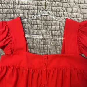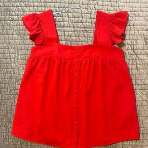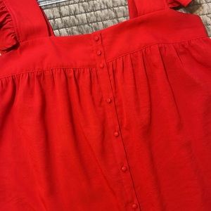 Vibrant red blouse with ruffle sleeves. Button-down front. Square neckline.