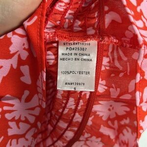 Red and pink tropical print single shoulder top. Top is smocked with peplum hemline. 100% polyester material. Size small. Non smoking home.