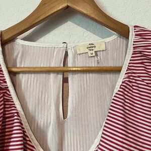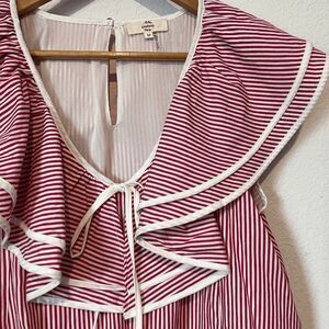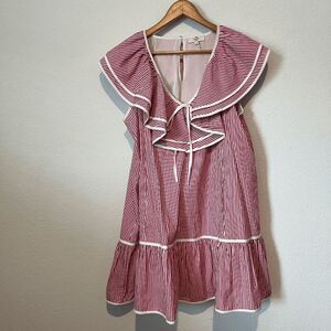 Chic mini dress with red and white stripes. Features a ruffled neckline and hem. Perfect for casual outings.