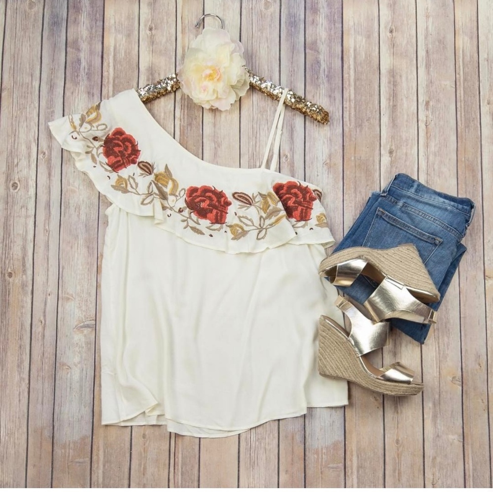 Brand new with tags Entro Boutique One Shoulder ruffle tank. Cream with red rose embroidery.