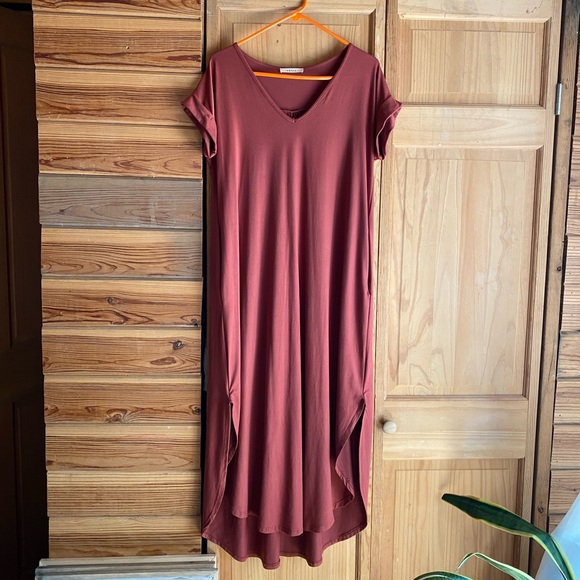 Entro rust colored dress with pockets. It’s a size small but definitely an oversized small.