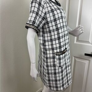 Chic black and white plaid dress with short sleeves. Features stylish pocket details.