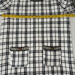 Chic black and white plaid dress with short sleeves. Features stylish pocket details.