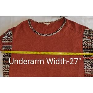 Previously Owned Southwestern Sweater Top. Main color is an Auburn and it has patches of a material with geometric designs. The bottom has fringe. Oversized/ Lagen look. There are some flaws, so please read condition below.