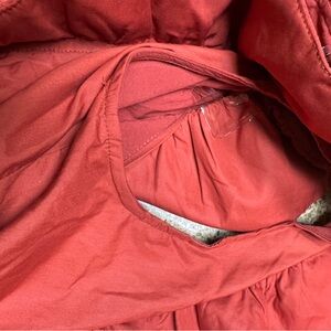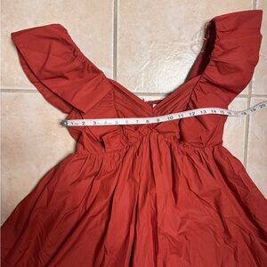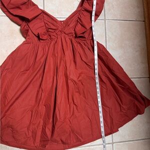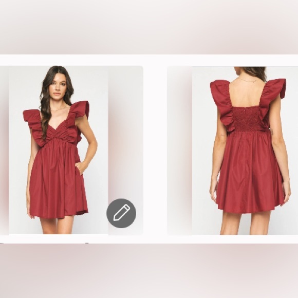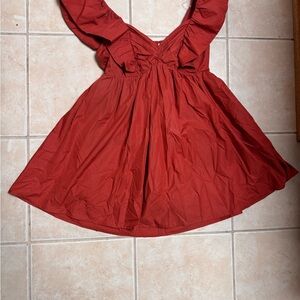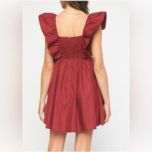 Stylish red dress with ruffled sleeves. Perfect for casual outings.