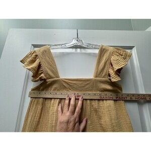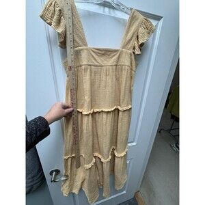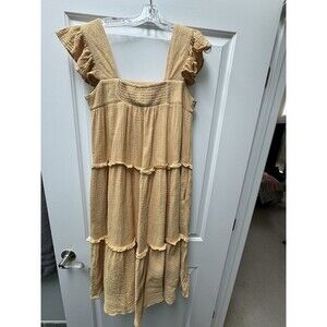 This is Entro Clothings tiered boho midi dress in 100% cotton for a cool summer day. Sleeveless with a ruffled hemline in a maize mustard yellow color. Generously oversized for a flowy, airy fit. This dress has been washed, so it will arrive at your home fresh and clean and ready to wear. Ships from the Midwest.