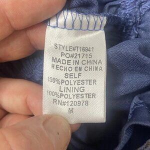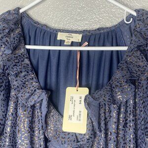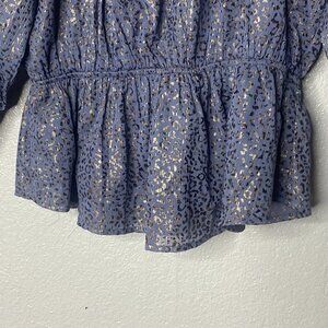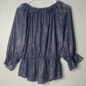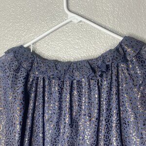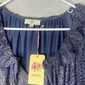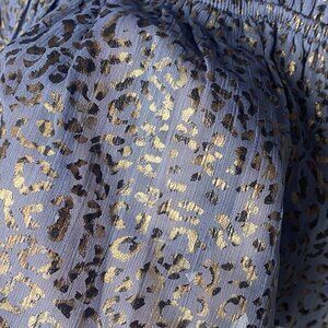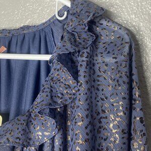 Entro Top Ladies Blue w/ Metallic Gold Leopard 3/4 Sleeves Ruffled V Neck