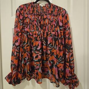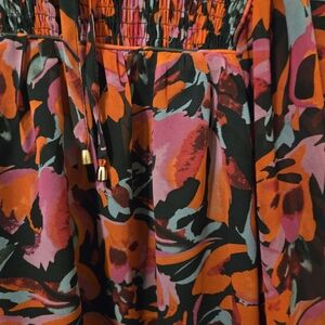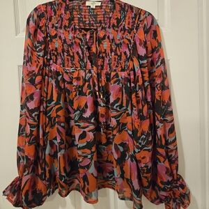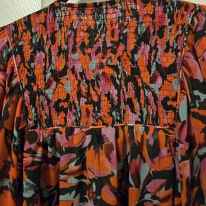 Colorful top with striking patterns. Features shades of orange, pink, and black.
