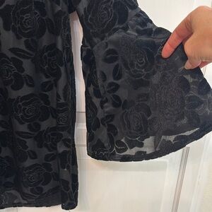 This elegant black blouse from Entro features velvet roses and flutter sleeves. Size M.