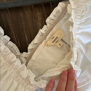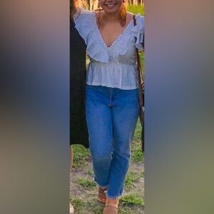Chic white blouse with layered ruffles. V-neck design. Perfect for stylish spring/summer outings. Size small. Great condition. Perfect statement piece to add with a fun skirt or shorts