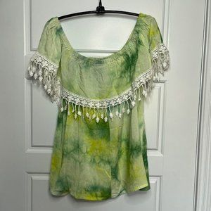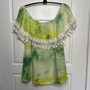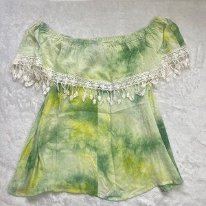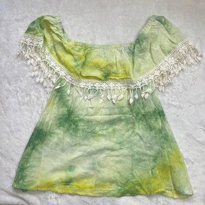 Entro Women's 100% Rayon Green, Yellow Tie Dye Off Shoulder Lace Trim Top L NEW