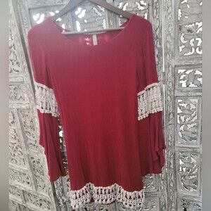 Entro Womens Burgundy Bohemian Long Bell Sleeve Dress with Crochet Accent Detail