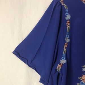 Entro Women’s Embroidered Tunic Blue size L Short Bell Sleeves Boho Hippie Flowy 100% Rayon