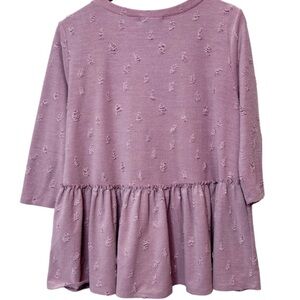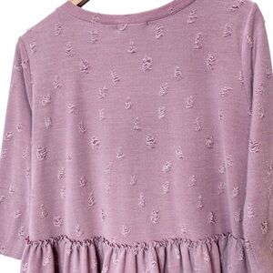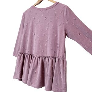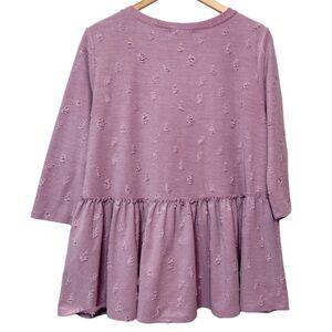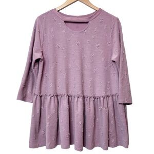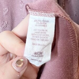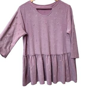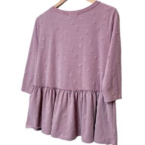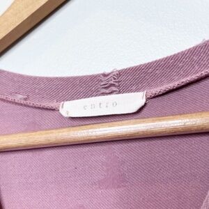 Entro 3/4 Sleeve Babydoll Blouse. Dusty Pink Rose color. Distressed pattern allover. Babydoll style with tier panel at hem. Half circle keyhole cutout at neck. Crew neckline. Size M. Style: 3183. 84% Polyester, 12% Rayon, 4% Spandex. Made in USA. Hand wash cold. Dry clean.