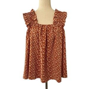 Entro, floral blouse, rust top, cottagecore, boho top, ruffle strap top, summer blouse, sleeveless top, romantic blouse, womens medium, feminine style, square neck